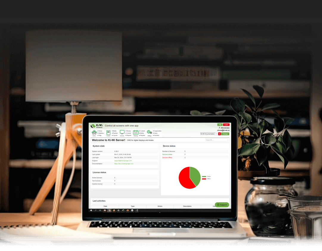 Create and plan content displayed on touch and traditional screens regardless of their type, brand or operating system. Integrate and control scanners, printers or other third-party SW and HW with Ki-Wi Signage solution